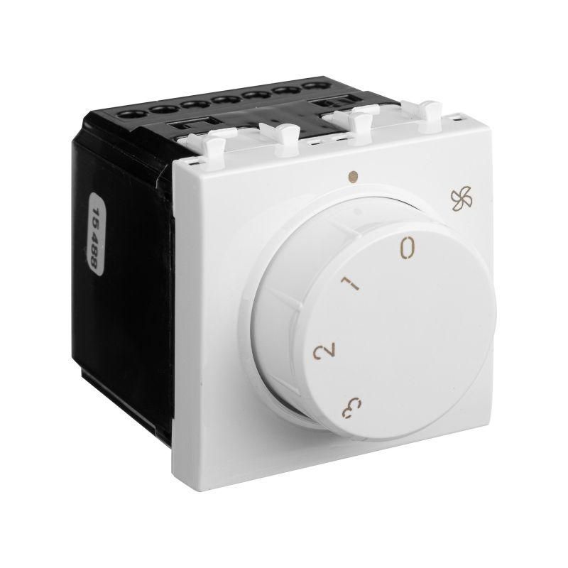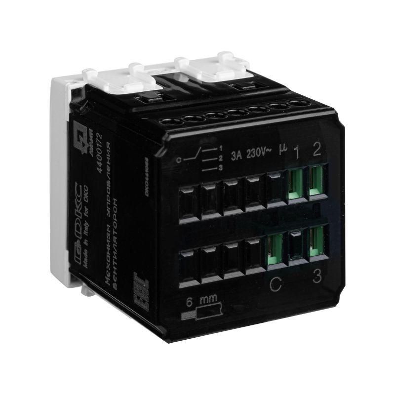 Механизм управления вентиляторами от ДКС встраивается в настенный кабель-канал и используется для изменения скорости вращения лопастей вентилятора. Конструкция предусматривает переключение по трем возможным скоростям и режим покоя. Изменение скорости производится поворотом колесика-регулятора. Номинальное напряжение ЭУИ – 230 В. Изделие имеет цвет "Белое облако", оттенок с универсальной сочетаемостью, который подойдет к любому цветовому решению и стилю оформления интерьера.