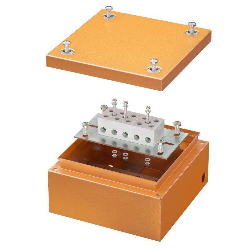 Назначение металлических огнестойких ответвительных коробок – соединение и ответвление проводов и кабелей с сохранением работоспособности при пожаре. Коробки применяются прежде всего в составе огнестойких кабельных линий и прошли испытания в соответствии с ГОСТ Р 53316-2009 с различными производителями кабеля. Материал – сталь, цвет – оранжевый RAL 2003. В комплект поставки коробок входят керамические клеммники, а также огнестойкие метизы (монтажная пластина, анкера, винты, шайбы, гайки).