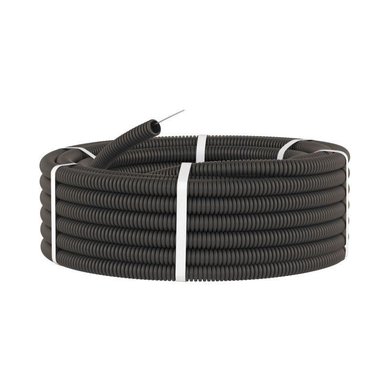 Труба гофрированная ПНД d50мм с протяж. черн. (уп.15м) ДКС 71750 используется для прокладки силовых и слаботочных линий, электрических, телефонных, компьютерных, телевизионных сетей. Изготовлена из ПВХ, серого цвета. Отличается прочностью и жесткостью, защищает проводку от механических повреждений, пыли, предохраняет от последствий короткого замыкания в сети. Устойчива к износу и старению. Требует защиты от воздействия ультрафиолетовых лучей и осадков. При открытой уличной прокладке необходим навес для защиты.