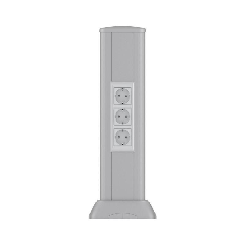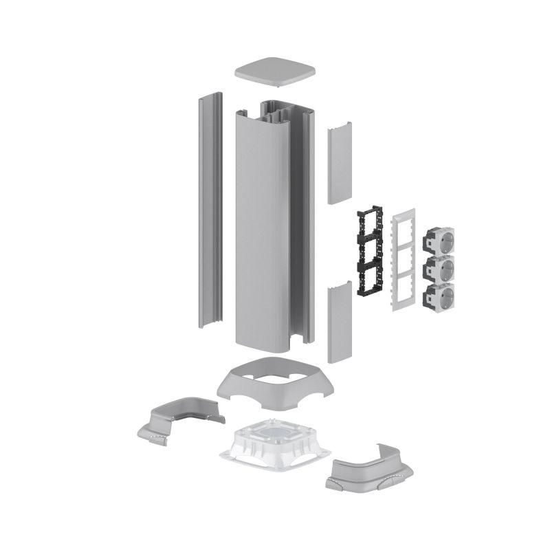 Колонна высотой 0,5 м. Назначение: организация рабочих мест в помещениях, где рабочее место находится далеко от стен. Условия монтажа: колонна крепится к полу в 4 точках; подвод кабелей с помощью гофрированных труб или в напольном кабель-канале ДКС; колонны рекомендуется заземлять; монтаж ЭУИ осуществляется при помощи каркасов и рамок, которые используются в коробах "In-liner Aero", "In-liner Front". Варианты наполнения колонны электроустановочными изделиями: установить 5 рамок на 2 модуля каждая = итого по 10 модулей с каждой стороны колонны = итого 20 модулей; установить 3 рамки на 4 модуля каждая = итого по 12 модулей с каждой стороны колонны = итого 24 модуля; установить 2 рамки на 6 модулей каждая = итого по 12 модулей с каждой стороны колонны = итого 24 модулей. Характеристики: материал стойки и крышек – алюминий; материал прочих комплектующих – сталь, полипропилен, АБС-пластик; отсеки колонны можно разделить по всей длине на 2 или 3 части при помощи пластикового разделителя (код 01415); можно установить ЭУИ серии "Avanti", "Viva" и 45х45 мм с помощью каркасов и рамок; ЭУИ монтируются с 2-х сторон; максимально возможно поставить 12 модулей ЭУИ с каждой стороны – итого 24 модуля. Комплектация: стойка колонны алюминиевая – 1 шт.; крышка колонны алюминиевая – 2 шт.; заглушка торцевая верхняя пластик – 1 шт.; база на пол металлическая – 1 шт.; накладка лицевая на базу пластик. – 1 шт.; накладка внутренняя на базу пластиковая – 2 шт.; винт – 4 шт.; инструкция по монтажу. Цвет: темно-серебристый RAL 9006