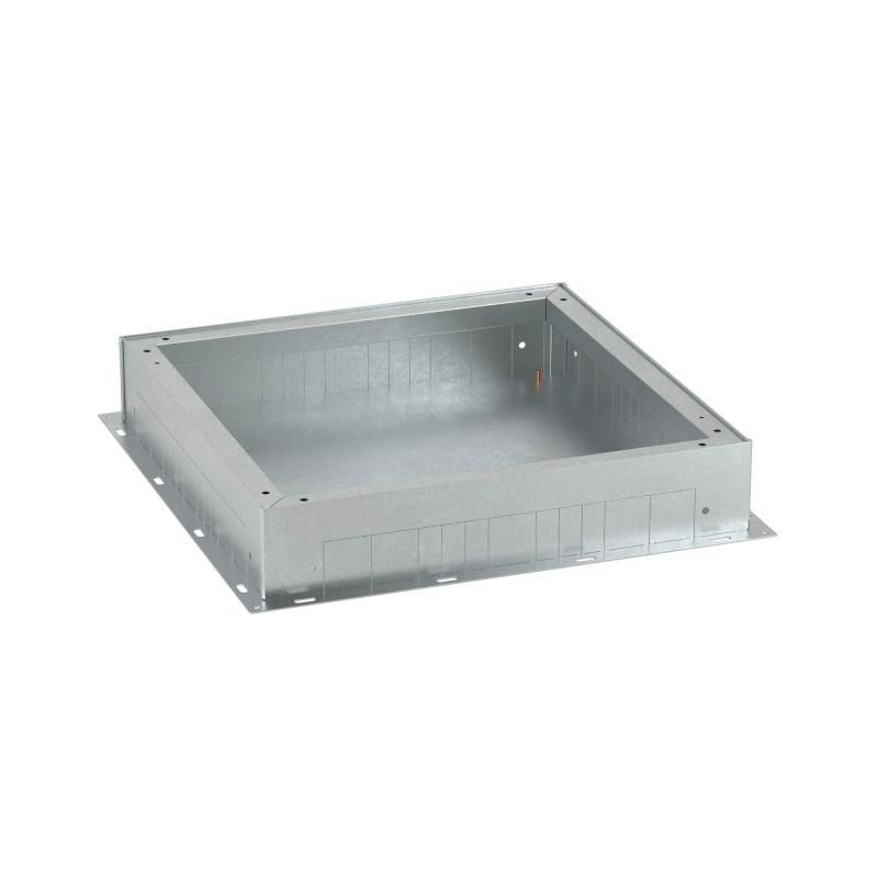 Опалубка для лючков металлическая. Назначение: организация рабочих мест с помощью лючка; организация мест распайки (в качестве распределительной коробки). Характеристики: минимальная высота стяжки 100 мм; высота монтажа регулируется с помощью 4-х специальных винтов, расположенных в углах по периметру опалубки; для монтажа специальный инструмент не требуется; перед установкой крышки, предназначенной для монтажа лючка (код 88212), или сплошной металлической крышки (код 88235), временная крышка (стальная, оцинкованная, идет в комплекте с опалубкой) удаляется сразу после заливки; с 4-х сторон на боковых стенках находится перфорация для ввода стальных (неперфорированных) лотков ДКС с крышками и перегородками серии "S5 Combitech" (типоразмером 50х50, 100х50, 150х50, 200х50, 300х50 или 400х50 мм); с 4-х сторон на боковые стенки можно установить пластины, в каждой из 6-ти отверстий диаметром 50 мм, с кабельными вводами (код 88236); винт заземления расположен внутри опалубки, на дне. Комплект поставки: временная крышка из оцинкованной стали 0,8 мм; металлическая пластина для фиксации кабельных вводов; 6 кабельных вводов диаметром 50 мм для ввода труб в опалубку; метизы.