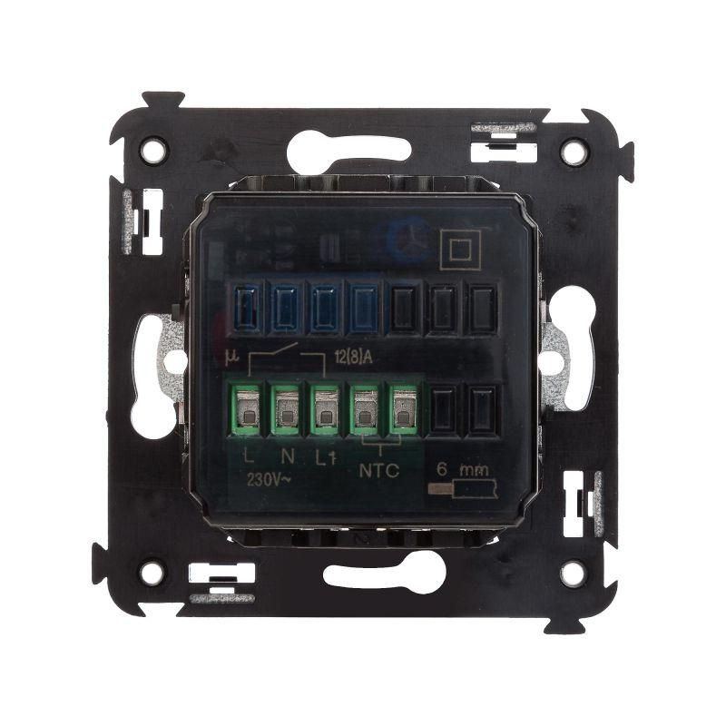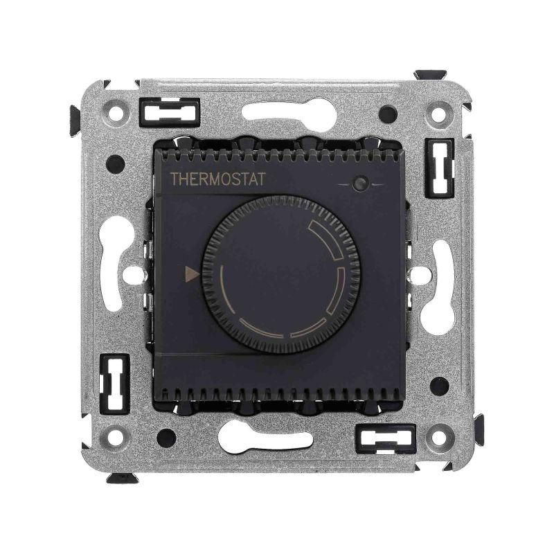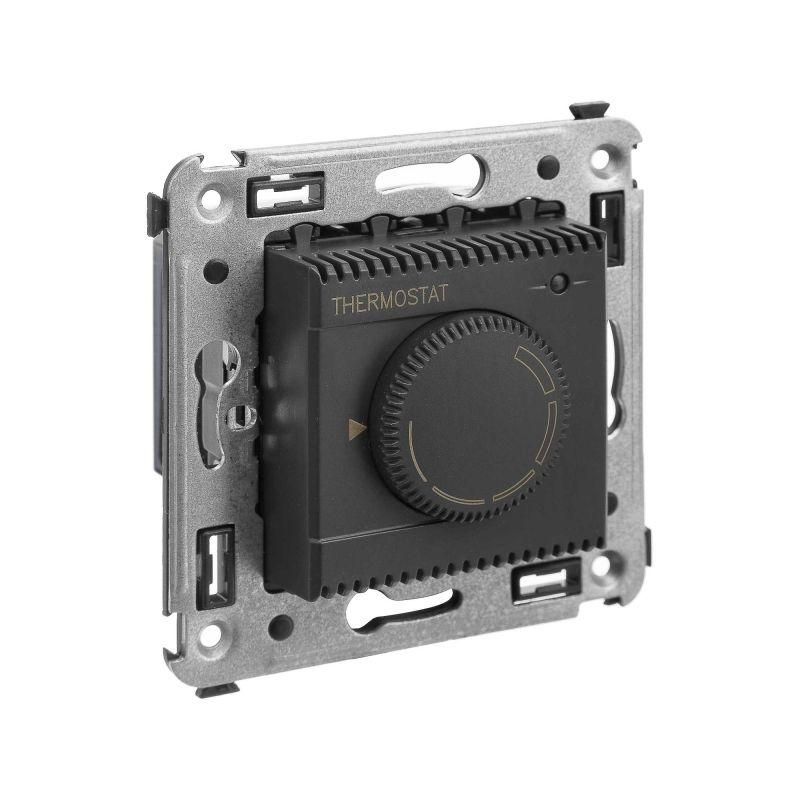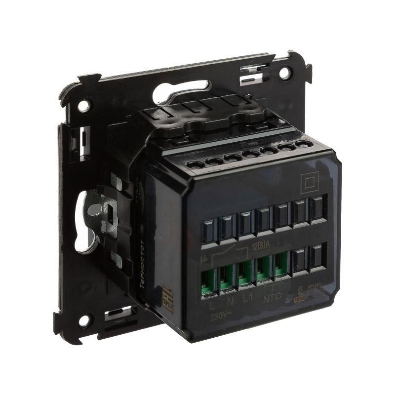 Термостат для теплых полов. Назначение: для монтажа в подрозеточные коробки глубиной не менее 45 мм (код 59301);. Предназначен для управления теплыми полами. Характеристики: диапазон от 5 до 30 °C; частота – 50–60 Гц; номинальное напряжение – 230 В; лампа-индикатор включается, когда температура в комнате падает ниже выбранного значения; нагрузка: 5 A – cos?=1, 2 A – cos?=0,4. Фиксация производится в подрозеточные коробки глубиной не менее 45 мм при помощи каркаса с лапками (код 4400802) и саморезов; провод датчика температуры в комплекте (длина 3,5 метра). 2 модуля. Цвет: "Черный матовый".