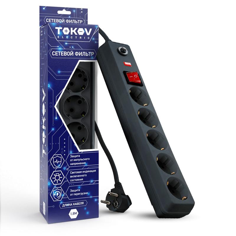 Удлинитель с сетевым фильтром 5х1.8м с заземл. с выкл. 16А с защ. от скачков напр. и перегрузок 3х1 сер. TOKOV ELECTRIC TKE-C06-SF5-1.8-ZV