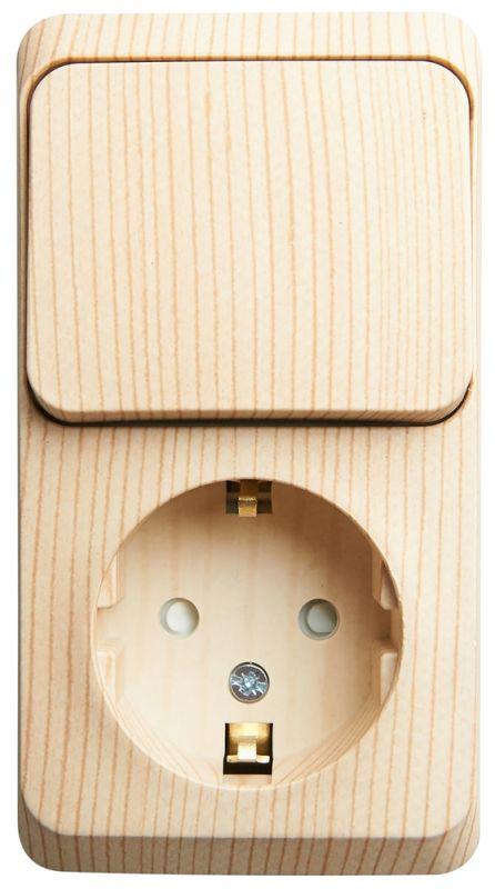 Блок ЭТЮД (сосна, открытой установки) предназначен для применения в сетях до 250В, состоит из розетки на 16А с заземлением и шторками и одноклавишного выключателя на 10А. Он удобен в применении и отлично подходит для коридора. Заземление обеспечивает безопасность при косвенном прикосновении. Изделия цвета Сосна обладают уникальным рисунком, напоминающим древесный сруб. Сделано в России.