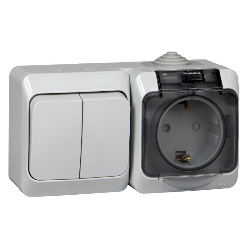 Блок ЭТЮД (серый, открытой установки) предназначен для применения в сетях до 250В, состоит из розетки на 16А, со шторками, без заземления и двухклавишного выключателя на 10А Две клавиши позволяют управлять двумя источниками света с одной точки. Он удобен в применении и отлично подходит для ванной комнаты (IP44). Сделано в России.