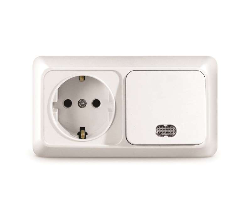 Блок ОП Олимп 1-кл. вык. с подсветкой + роз. с заземл. горизонт. бел. UNIVersal О0036 представлен потребителю в серии "Олимп". Серия "Олимп" для открытой установки сочетает в себе функциональность с практичностью. Изделия данной серии удачно вписываются в интерьер любого помещения и производят приятное впечатление. Блок объединяет одноклавишный выключатель и розетку. Корпус представляет собой форму из пластика, белого цвета. Контактная группа изделий изготовлена из латуни. Монтируется горизонтально, на глубину 48 мм, на поверхность стены. Рекомендованы для жилых помещений и административных зданий. Срок службы составляет 5 000 циклов включения/отключения.