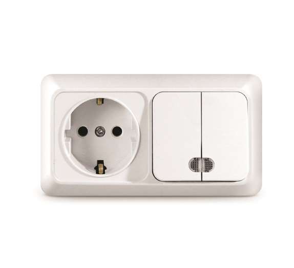 Блок ОП Олимп 2-кл. вык. с подсветкой + роз. с заземл. горизонт. бел. UNIVersal О0037 представлен потребителю в серии "Олимп". Серия "Олимп" для открытой установки сочетает в себе функциональность с практичностью. Изделия данной серии удачно вписываются в интерьер любого помещения и производят приятное впечатление. Блок объединяет двухклавишный выключатель и розетку. Корпус представляет собой форму из пластика, белого цвета. Контактная группа изделий изготовлена из латуни. Монтируется горизонтально, на глубину 48 мм, на поверхность стены. Рекомендованы для жилых помещений и административных зданий. Срок службы составляет 5 000 циклов включения/отключения.