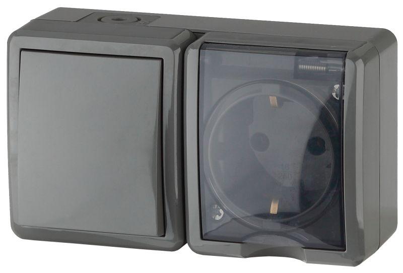 Блок розетка с выключателем влагозащищённый IP54 серии Эра Эксперт открытой установки цвет серый 11-7401-03. Номинальные характеристики 16А 250В . Устройство выполнено из качественного поликарбоната, оснащёно уникальными винтовыми клеммами ЭКСПЕРТ для максимально качественного зажима кабеля в механизме.