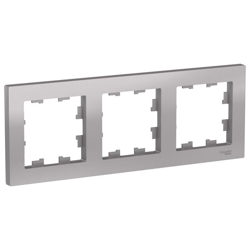Рамка AtlasDesign (цвет алюминий) трёхместная. - Устанавливается в вертикальном и горизонтальном положениях. - Лицевые детали из качественного ABS-пластика, устойчивого к царапинам и УФ-излучению. - Позволяет гармонично вписать электроустановочное изделие в интерьер помещения.