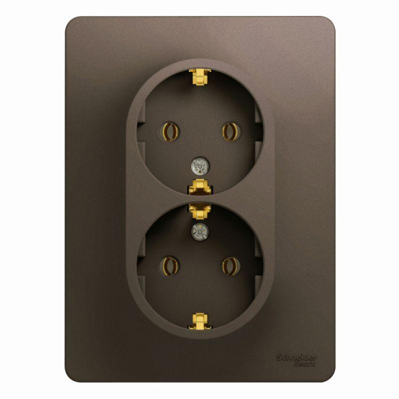 Розетка двойная Glossa (в сборе, цвет шоколад) с заземлением, без шторок подходит для сетей 250 В, на ток 16 А. - Заземляющий контакт обеспечивает дополнительную защиту от удара электрическим током. При наличии заземления электрический потенциал уходит в землю, защищая человека. - Выполнен из материала PС+ASA, стойкого к УФ-излучению и появлению царапин. - Двойная розетка позволяет подключить два устройства в одном месте.