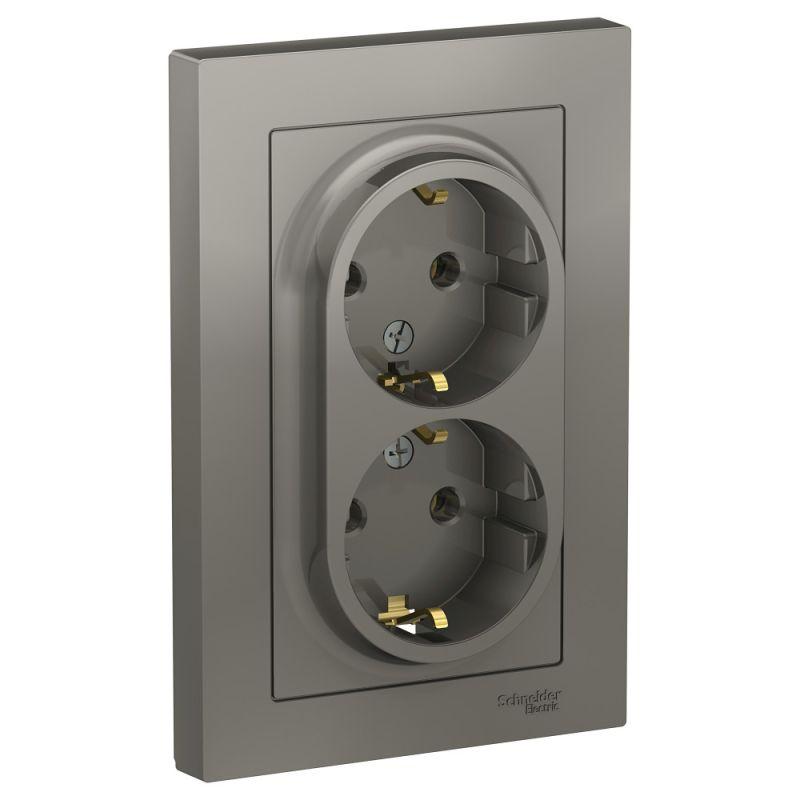 Розетка двойная AtlasDesign (в сборе, цвет сталь) с заземлением, без шторок подходит для сетей 250 В, на ток 16 А. - Заземляющий контакт обеспечивает дополнительную защиту от удара электрическим током. - Лицевые детали из качественного ABS-пластика, устойчивого к царапинам и УФ-излучению. - Двойная розетка позволяет подключить два устройства в одном месте. - Изделие поставляется в комплекте с рамкой того же цвета.