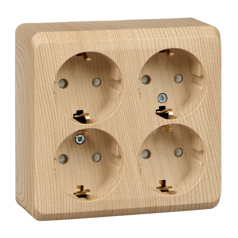 Розетка ЭТЮД (сосна, открытой установки) четырёхместная с заземлением и шторками предназначена для применения в сетях до 250В, на ток до 16А. Четырёхместная розетка позволяет подключить четыре устройства в одном месте. Шторки и заземление обеспечивают дополнительную безопасность при косвенных прикосновениях. Изделия цвета Сосна обладают уникальным рисунком, напоминающим древесный сруб. Сделано в России.