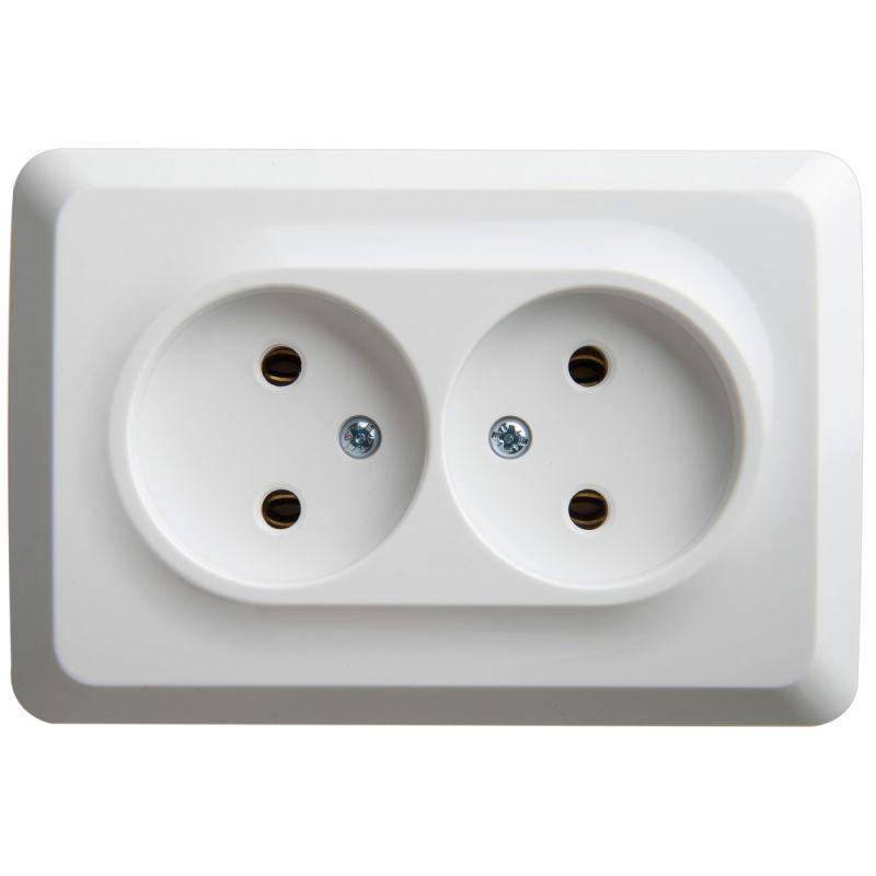 Розетка ЭТЮД (белый, открытой установки) двухместная угловая, без шторок и заземления предназначена для применения в сетях до 250В, на ток до 16А. Двухместная розетка позволяет подключить два устройства в одном месте. Ее конструкция позволяет установить розетку в угол помещения. Сделано в России.