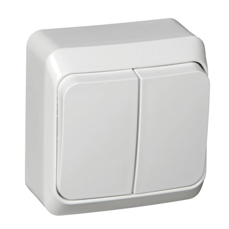 Выключатель ЭТЮД (белый, открытой установки) двухклавишный предназначен для применения в сетях до 250В, на ток до 10А. Наличие подсветки делает его легко находимым при отсутствии освещения. Две клавиши позволяют управлять двумя источниками света с одной точки. Сделано в России.