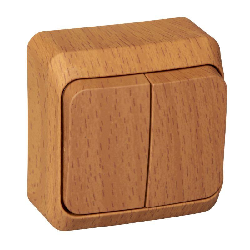 Выключатель ЭТЮД (бук, открытой установки) двухклавишный предназначен для применения в сетях до 250В, на ток до 10А. Две клавиши позволяют управлять двумя источниками света с одной точки. Изделия цвета Бук обладают уникальным рисунком, напоминающим древесный сруб. Он прост в установке и удобен применении. Сделано в России.