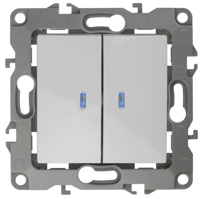 Выключатель 2-клавишный с подсветкой серии Эра 12 скрыт.установки механизм цвет белый 12-1105-01. Номинальные характеристики 10А 250В . Сделан из поликарбоната, оснащёно автоматическими клеммами для быстрй и надёжной фиксации жил кабеля в механиме. Парные клеммы обеспечивают соединение шлейфом. Монтаж в подрозетник производится и на лапки, и на винты. Рамки приобретаются отдельно. Рамки Эра 12: 1 пост 12-5001-хх, 2 поста 12-5002-хх, 3 поста 12-5003-хх, 4 поста 12-5004-хх, 5 постов 12-5005-хх. Рамки Эра 12 Сатин: 1 пост 12-5101-хх, 2 поста 12-5102-хх, 3 поста 12-5103-хх, 4 поста 12-5104-хх, 5 постов - 12-5105-хх (хх - код цвета: 01-белый, 02-слоновая кость, 03-алюминий, 04-шампань, 05-антрацит, 06-чёрный, 07-ольха(белёный дуб-сатин), 08-вишня, 09-дуб, 10-венге, 11-сосна, 21-жёлтый, 22-оранжевый, 23-красный, 24-охра, 25-бордо, 26-лайм, 27-зелёный, 28-голубой, 29-синий).
