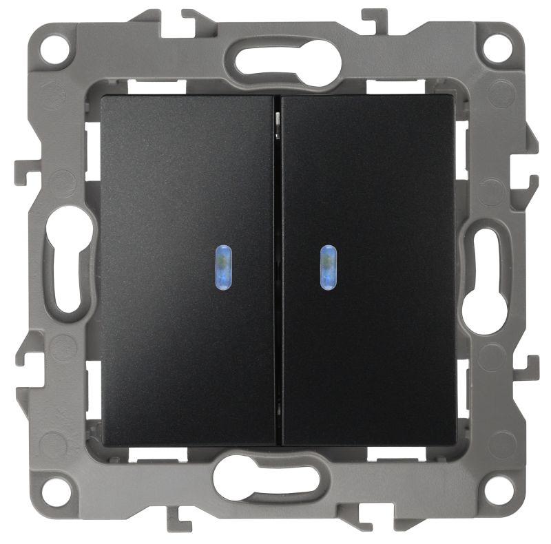 Выключатель 2-клавишный с подсветкой серии Эра 12 скрыт.установки механизм цвет антрацит 12-1105-05. Номинальные характеристики 10А 250В . Сделан из поликарбоната, оснащёно автоматическими клеммами для быстрй и надёжной фиксации жил кабеля в механиме. Парные клеммы обеспечивают соединение шлейфом. Монтаж в подрозетник производится и на лапки, и на винты. Рамки приобретаются отдельно. Рамки Эра 12: 1 пост 12-5001-хх, 2 поста 12-5002-хх, 3 поста 12-5003-хх, 4 поста 12-5004-хх, 5 постов 12-5005-хх. Рамки Эра 12 Сатин: 1 пост 12-5101-хх, 2 поста 12-5102-хх, 3 поста 12-5103-хх, 4 поста 12-5104-хх, 5 постов - 12-5105-хх (хх - код цвета: 01-белый, 02-слоновая кость, 03-алюминий, 04-шампань, 05-антрацит, 06-чёрный, 07-ольха(белёный дуб-сатин), 08-вишня, 09-дуб, 10-венге, 11-сосна, 21-жёлтый, 22-оранжевый, 23-красный, 24-охра, 25-бордо, 26-лайм, 27-зелёный, 28-голубой, 29-синий).
