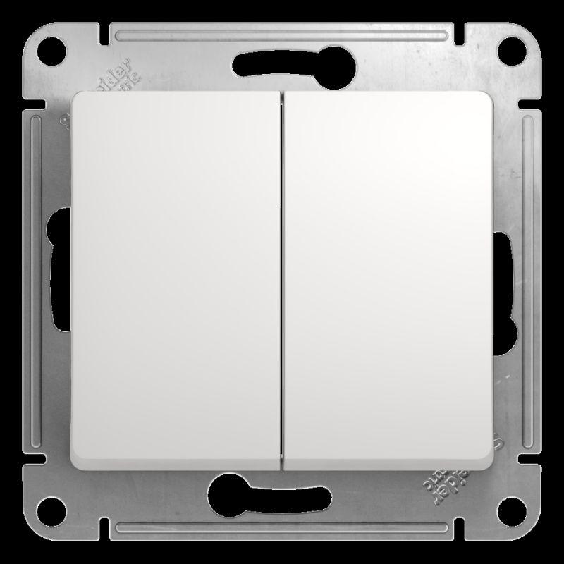 Механизм Glossa (цвет белый) выключателя 2-клавишного подходит для сетей 250 В, на ток 10 А. - Двухклавишный выключатель позволяет управлять двумя источниками света с одной точки. - Выполнен из материала PС+ASA, стойкого к УФ-излучению и появлению царапин. - Эргономичные клеммы расположены в два ряда: сверху и снизу.