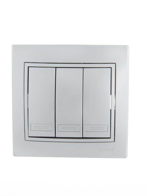• НАЗНАЧЕНИЕ Выключатель 3-клавишный это двухпозиционный коммутационный аппарат с замыкающими (нормально-разомкнутыми) контактами, предназначенный для работы в сетях с напряжением до 1000 вольт, не предназначенный для отключения токов короткого замыкания, без специальных устройств дугогашения, местного управления, с ручным приводом. • ОБЛАСТЬ ПРИМЕНЕНИЯ В основном применяются для включения и выключения освещения в бытовых и производственных условиях. • ПРИНЦИП ДЕЙСТВИЯ Принцип действия основан на коммутации контактов механическим способом (нажатием) , при этом положения коммутации фиксированы и позволяют находится в этом режиме достаточно долго, вплоть до следующего воздействия. • ДОПОЛНИТЕЛЬНЫЕ ПРИНАДЛЕЖНОСТИ ИЛИ АКСЕССУАРЫ